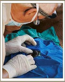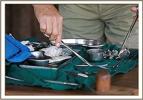 It was very fortunate that Dr. Schwendemann studied and practiced cataract surgery in the seventies, so he is proficient at “the old-fashioned way” as well as with the modern more sophisticated laser techniques that would have proved impossible under field conditions. Added to this, a rhino apparently does not only have the swivel movement of the eye, but also a suction mechanism enabling the eyeball to be drawn in or up and down as a protective measure. Therefore, the use of a microscope would have proved difficult, since the constant eyeball movement would put it out of focus much of the time. Using magnified goggles the Specialist was able to compensate simply by moving his head.