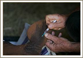 It had always been a puzzle as to how Max came to be blind in both eyes. It is not unusual for Black Rhino to be blinded in one, the eye being damaged either during sparring bouts or when fleeing through dense thorn bush thickets where rhinos sequester themselves for protection. But why both eyes? Dr. Schwendemann was able to determine that there was evidence of a foreign body having punctured the cornea of the eye on which he was working, which probably caused the cataract to grow. It will be very interesting to see what he finds in the other eye when the time comes, assuming that the operation on the first eye proves successful and the cataract does not grow back.