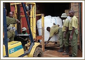 So on the afternoon of the 27th October, the welcomed sight of 2,000 kgs of milk powder for our infant charges arrived on palettes in the back of the Finlay's Canter lorry. The 3 huge bags were extremely heavy so the Kenya Wildlife Service came to the rescue by allowing us to use their forklift truck to unload the milk from the lorry and replace the milk in the milk store container.
