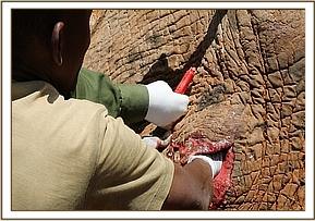 Fortunately, the wound had been discovered early and the infection was not far advanced. Incisions were made and a few kilos of necrotic flesh was removed before the culprit was discovered: a poisoned arrow. Once cleaned and packed with green clay, she was given a dose of long-lasting antibiotic and painkiller and administered with an antidote for the anaesthetic. Short moments later she was on her feet and rushing to reunite with her calf and her herd. It is hoped that in the coming weeks she will make a reappearance at the stockade so that she can be checked on, but the vet is confident that she will make a fast recovery.