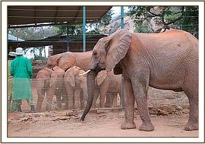 Soon it was time for the Keeper Dependent group, led by Loijuk, to go into their Stockades for the night. Kilaguni, Sabachi and Chaimu were put in one with Meibai and weak Sian, but Dame Daphne asked that Loijuk be with them, since she suspected that Meibai might be a little jealous, having been the smallest and as such having enjoyed the undivided attention and adoration of all the Ithumba elephants, Now, confronted by three even smaller, and having witnessed the enthusiasm with which they were greeted, sure enough Meibai was a little pushy, trying to mount onto Kilaguni, with Loijuk too kind to discipline him properly, so he was moved next door, in with Makena, Kora, and Zurura. Keeper Mischak remained with the Nursery newcomers for a long time to settle Kilaguni, who was crying a lot and who, according to Mischak, was missing his Nursery blanket! But Loijuk comforted him, as did weak and ailing Sian and soon all three newcomers were happily feasting on the greens provided for them.