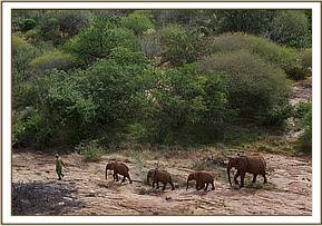 Meanwhile, unbeknownst to us, Yatta’s group of Ex Ithumba orphans now living wild and totally independent of their erstwhile human family were a long way from the Stockades but monitored by a Keeper who had followed their tracks as they left the Stockade compound the previous day. Kinna peeled off from Yatta’s group, and hurried back to the Stockades to join the Junior Keeper Dependent elephants led by Loijuk, who were attended by their Keepers as usual and were browsing not far from the Stockades.