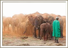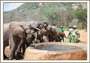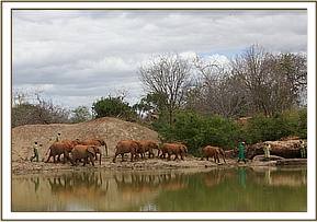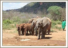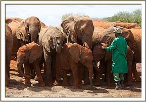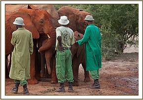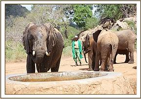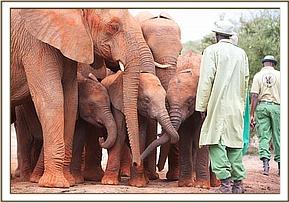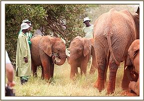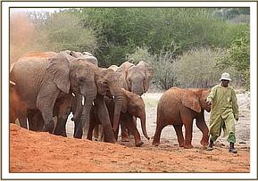 That same afternoon, Yatta and all the ex orphans came to greet the newcomers, amongst whom was Yatta’s wild recruit, the young bull of about 14 we have named “Mgeni”(meaning “the visitor”), who is now more or less a permanent member of Yatta’s group who walks with the Keepers and even responds to their commands. It was an incredible sight to witness the outpouring of affection and concern by about 30 large now ostensibly “wild” elephants for three tiny miniatures in their midst and all attended by the human family who had reared them all and steered them into adulthood. Most incredible of all was the instant recognition of the Keepers by the ex orphans and the heartfelt greetings the Nairobi based Keepers who had accompanied the three babies received from elephants some of them had not seen for many years! It was not only the babies who were overwhelmed, but also the Nairobi Keepers who had known all the ex orphans in the Nursery, and who could not even begin the recognize their now grown erstwhile charges!