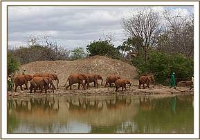 The Keepers brought the three newcomers in first for their milk feed, and all soon began enjoying the dusbath. Loijuk’s group then joined them, and once those still milk dependent had taken their milk, all thoroughly enjoyed the dustbath, showers of brick red Tsavo earth tossed into the air and over bodies. Because the weather was overcast, the elephants were reluctant to go into the pool for a swim. Kilaguni, Sabachi and Chaimu would have liked to do so, but never having seen what was, in effect, a miniature lake, they were too scared to do so, so they too only threw water over themselves. Then Yatta’s ex orphans all came in one very large herd of large elephants, the wild recruit “Mgeni” amongst them. Once again the attention of all the big females was concentrated on the three latest arrivals with Chaimu and Sabachi now enjoying again being a small member of a big herd of bigger elephants. They basked in the attention, but Kilaguni still needed to be close to the Keepers and tried to remain so all the time. The whole herd thoroughly enjoyed the dusting session, the Imax camera meanwhile swiveling above and around them as they emerged through clouds of thrown red soil. Wild boy Mgeni planted himself in the middle of the earthpile, obviously enjoys the respect of all the younger bulls, none of whom dared “mess” with him. Buchuma and Ndomot took themselves to the opposite side of the pool and engaged each other in a play fight, sparring with each other, diving into and rattling the bushes before suddenly popping out again to try and get the opponent by surprise; sometimes lying down on the huge bank of sloping rock before jumping up and pushing each other all over again. They then went into the pool and enjoyed a swim after all the activity, where they were joined by one or two others and came out the colour of charcoal, for their red dusting session! All this was captured on film for the Big Screen, the only downside being that the weather could have been more cooperative. Most of the morning was overcast rather than sunny.