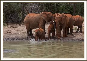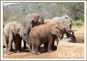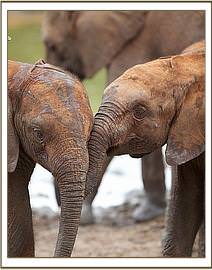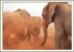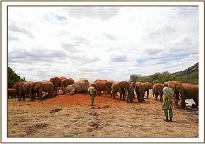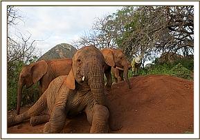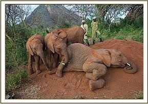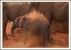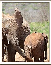Meanwhile, Yatta’s entire group of ex orphans remained in the yard, watching the new babies, and just wandering off to browse nearby. Early the next morning they were all back to envelop them all over again. Meanwhile, the IMAX crew, who captured the initial greetings on film, had moved their huge Camera and all the equipment to the mudbath venue, where a large pile of soft red earth had been provided for a fresh dustbath which elephants all enjoy after bathing.