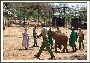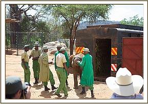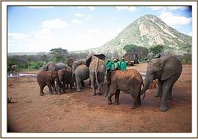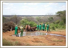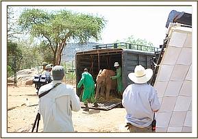 Three large trucks parted at the Nursery Loading Bays always herald an important day in the lives of the Nursery elephants. It is, in fact, a celebration of life for three more infant elephant orphans who could otherwise not have survived. It is their graduation from the intensive care of fragile infancy having been healed in both body and mind, Kilaguni without a tail, which was eaten by the hyaenas who came to feast on the body of his dead mother, Chaimu with one partially blind eye, probably poked by a stick during the panic of losing her mother to poachers, and Sabachi with a trunk chewed by preditors, and the sinister connotations of being stuck in mud and abandoned by his elephant family . Although they will remain milk and Keeper dependent for many more years, it is now time to expose them to a natural wild situation so that the inborn genetic memory with which all elephants are endowed (which we humans term “instinct”) becomes honed by exposure, equipping the elephant to be able to lead a perfectly normal wild elephant life again with the passage of time.