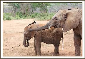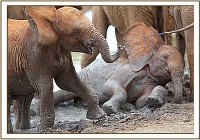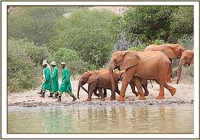 As always the greeting was exuberant, enthusiastic, warm and loving, all the established orphans crowding around the newcomers, which the three babies at first found a little overwhelming. The only elephant they vaguely knew amongst that group of much bigger elephants would have been Meibai, who shared only a short time with them in the Nairobi Nursery after coming in as an older emaciated 2009 drought or poaching victim. After the initial highly charged greeting, Kinna and Loijuk and all the Keeper dependent orphans escorted the three newcomers in their midst to the mudbath, where all cooled themselves. They were then taken by the Keepers out into the bush to browse, the three newcomers confronted with a wide variety of delicious elephant food plants not found in Nairobi.