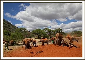 At the Ithumba Stockades orphans who have graduated from the Nairobi Nursery embark on the next important phase of their reintroduction back into the wild elephant community of Tsavo East National Park – a journey made easy for them, because another 28 Ex Ithumba Orphans all Nursery reared from early infancy have already accomplished that transition and are living wild but still keeping in close touch with milk and Keeper dependent “babies” secured for safety during the hours of darkness in the Ithumba Elephant Stockades. The Ex Orphans regard all Ex Nursery Youngsters as part of their “family” and welcome them into their large elephant hearts, embracing them, comforting them, reassuring them and showering them in love with an outpouring of boundless joy.