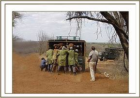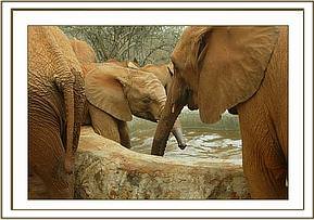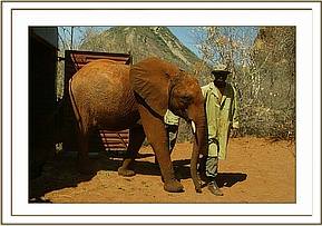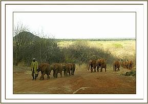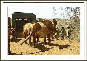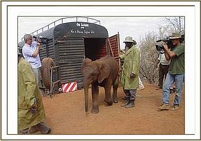This particular move of six of our Nursery Elephants has entailed a great deal of heart-searching and planning, being more complex than usual, since the decision had been taken that the time had come to split the Voi group. The installation of all the infrastructure required for the new Elephant Re-integration Facility at Ithumba in the Northern Area of Tsavo East National Park presented a daunting challenge, not least financially, but also due to the remoteness of the area, as well as communication and water constraints. An electrically fenced Stockade was already in place for Imenti’s use, but we had to build Staff Lines, Storage facilities for milk and drugs, Water Catchment Tanks to trap precious rainwater, drinking troughs etc., etc. as well as electrically fence the Northern boundary of the Park. At the eleventh hour the purchase of a 4.5 million K. Shs. motorized Tanker became essential in order to cart fresh water to dilute the salinity of the existing ground water in that part of the Park since earlier rains had failed to fill the tanks. We were nervous of exposing our precious Nursery inmates to water of such high salinity without allowing them to become accustomed to it over a period of time. By the June 18th - the deadline for the move - everything was in place, as well as the BBC Natural History Section to film the event for their proposed “Elephant Diaries” series. Luckily it happened that Imenti was also on a long walkabout having at last befriended the wild elephants, which was a relief, since his presence could cause something of a disruption at both an elephant and human level! The six Nursery inmates to be moved were Wendi ex Imenti Forest, (now aged 21 months and the mini-Matriarch of the Nursery), who came to us the day she was born, and like Imenti, was saved from certain death by an infusion of blood plasma taken from “Thoma” due to her latent immune system deprived of the mother’s first Colostrum milk; 2 year old Napasha (ex Mpala Ranch, Laikipia), OlMalo (aged 18 months, ex Loisaba Ranch Laikipia), Taita (aged 16 months, the cess-pit casualty, ex Taita Hills Hilton Sanctuary); and Selengai (aged 15 months also from Loisaba Ranch). The decision to move the six Nursery Elephants directly to the North had not been taken lightly and entailed a great deal of discussion between ourselves, (including Jill), and the Voi Keepers. Emily’s group, consisting of 31 still dependent elephants, had become unwieldy for the Keepers to manage during Tsavo’s long dry seasons, something that was highlighted during the last long dry season of 2003 when the October rains did not arrive until January 2004, and we were faced with possibility of having to walk the entire herd to better pastures. Which elephants to move was another matter of deep discussion, not taken lightly either, for this posed a new and huge challenge. Finally, it was decided that four of the younger females should be targeted for the North to provide the Matriarchal component for the Nursery babies, yet small enough not to rouse the mating aspirations of Imenti if and when he returned, as he was bound to do. Once these young females had settled in and adapted to their new charges and surroundings, we propose to walk some of the bulls of a similar age up to join them, allowing the females advantage over the bulls. Eventually it was decided that those to be moved would be from the four to five year old age set, namely Mulika (ex Meru Park) and Nasalot (ex Turkana), firm friends from their Nursery days; Kinna (ex Meru Park) and Yatta (ex Tsavo Triangle area) – also firm friends who had been together in the Nursery. It was felt that taking older ones from Emily and Aitong would cause a major upset and possibly dissention between Emily and Aitong, should Emily choose to replace her missing “favourites” by taking some from amongst Aitong’s special calves. Also the friendship between the four chosen youngsters was long-lasting and binding. They were sufficient unto themselves and had not yet made lasting friendships with the wild community, something the older elephants had already achieved. As usual, at the Nursery, the large Safari trucks that would be used for the move were in place for several days beforehand, backed up against the loading ramps so that the Nursery elephants could undergo loading practice by being fed their milk inside the open back. As usual, those orphaned old enough to clearly remember the trauma of a journey in a vehicle were the reluctant ones, namely Napasha and Taita.
