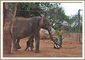 At the same time it was urgent to transfer 4 middle sized females from Emily’s Voi Stockade group to the North to act as older Matriarchs for the newly transferred Nursery six, there to comfort and care for them in an elephant way, even though they were still accompanied by their favourite Keepers. It was nevertheless important that behaviour from now on be taught in an elephant way prior to association with wild elephant herds. Then the wild Matriarchs would pass on their acquired knowledge. Targeted for this important assignment was Mulika along with Yatta, Nasalot and Kinna, a move that took place on the 26th June, 2004 and was famously documented on BBC’s Elephant Diaries series. And so, Yatta, Mulika, Nasalot and Kinna, all now aged round about five or six, went to Ithumba in three separate trucks, and immediately took control of the Nursery six, overjoyed to find themselves in charge of six small calves. For almost 2 years only Elephant Bulls (the Scouts of Elephant Society) visited the Ithumba Orphans, and then only under cover of darkness, until one Big Bull, nicknamed Friend (in Swahili) had the courage to show himself in daylight and even walk with the orphaned group and their Keepers, sharing their mud bath and even sleeping just outside their Night Stockades for many weeks, before heading out to pass the message that it was safe to do so to his wild friends, who have been coming in droves ever since.