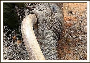 After the team was finished with the treatment of the first elephant, they embarked on treating the second one, a huge bull with large tusks who also had severe arrow injuries. Again the elephant was darted from the vehicle whilst the helicopter was used to keep the elephant from hiding in the thick surrounding bush.