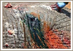 A penetrating arrow wound was observed on the left abdominal wall and an incision was made at the lowest point of the wound in order to drain away the pus and cut out the dead flesh before cleaning the wounds, administering antibiotics and finally covering the wound in green clay to aid healing.