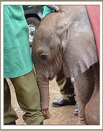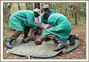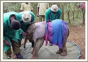 Today, we were all on edge, because the operation on Narripi’s hyena damaged trunk was scheduled for 2 p.m. and for that reason, he had to miss his 12 p.m. milk feed. Denying this very brave little baby the milk he so forcefully demands every 3 hours was a hard task! He pleaded, and he pushed his hung blanket, and sucked the Keepers’ fingers, confused as to why suddenly the life-giving milk bar had gone on hold! However, this was an important necessity, because vomiting whilst under anesthesia could be life threatening.