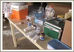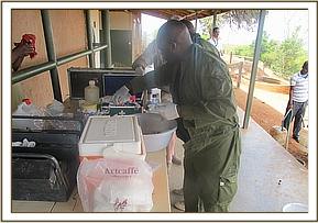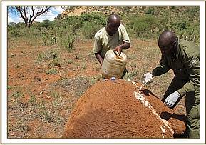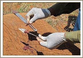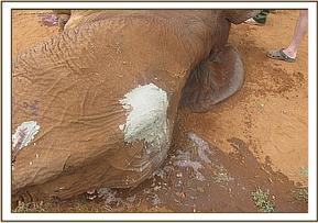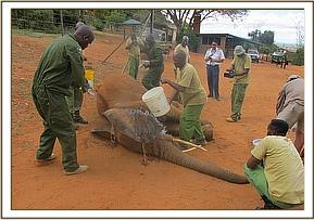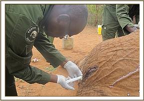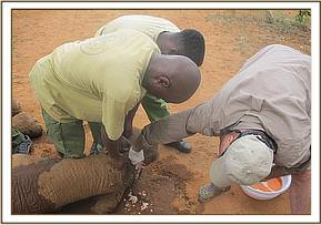 Joseph Sauni, the Head Keeper at the Voi Elephant Rehabilitation Centre in Southern Tsavo East National Park, was on a routine motorized patrol on the 13th April, 2012, when he happened upon the Ex Orphans of Emilys now wild unit, who were actually already on their way back to the Voi Stockades. Amongst them was Ndara, whom he noticed to be limping. Ndara was rescued from an open manhole on the main Nairobi Mombasa pipeline as an 8 month old calf way back in 2001. The Nairobi pipeline runs from Mzima Springs in Tsavo West, through Tsavo East and adjacent Ranches on its way to the Coastal town of Mombasa. Ndara was rescued from the manhole adjacent to Rukinga Ranch not far from the Buchuma Entrance Gate to the Park. She was flown to the Nairobi Nursery and when over two years old, and in the fullness of time graduated to the Voi Rehabilitation Stockades when just over two, there to embark on the long journey back to a normal wild life amongst the wild elephant community of Southern Tsavo East. This transition was accomplished in 2005, when she left Keeper dependency along with Emily (the reigning Voi Matriarch at the time) accompanied also by Loisaba, Ilingwezi, Tsavo, Laikipia, Salama, Aitong, and Sweet Sally who is now one of the main Nannies to Emilys first wild-born calf, little Eve, born on the l0th December, 2008. Ndara, now in her thirteenth year could very well be pregnant, but Joseph Sauni noticed that she was limping, and could see three arrows protruding from her body - one in her side, one in the back and one in the joint of the front left leg, which was causing her to limp. Dr. Poghorn, the Vet seconded by KWS to the Trusts Tsavo Mobile Veterinary Unit, was called upon to come and immobilize Ndara in order to remove the arrows, and treat the resulting wounds. This was done that same day (13th April) below the Voi Safari Lodge, after which Ndara was resuscitated and went off to catch up with Emilys unit, of which she was a part.