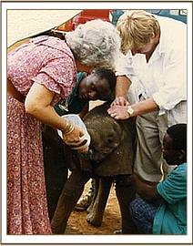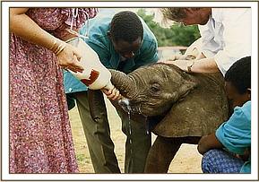 For the next few days he tore around the bush, bellowing and running after every rustle, searching desperately for a mother lost forever. When he was again in a state of near collapse, the Keepers managed to gently steer him back to join Malaika, his little forest friend who was also in bad physical shape but mentally accepting of the tragedy that had left her orphaned. It was extremely upsetting for us to witness the depth of their trauma, and the inevitable depression and grief that went on for months as they mourned they loved ones. Pressed close together for comfort, the two babies presented a pathetic picture, plagued by nightmares during the hours of darkness which haunted them and left them fearful of everything around them. However, they took milk, and gradually time healed their bodies and the input of the other Nursery elephants healed their tortured minds. They were showered by an out-pouring of love and compassion, as the other Nursery elephants empathized fully with their distress, all having suffered themselves in varying degrees when they, too, lost loved ones. The day when Ndume and Malaika first began to play all those years ago, was cause for celebration, and a joyous day indeed, in our Nairobi Nursery.