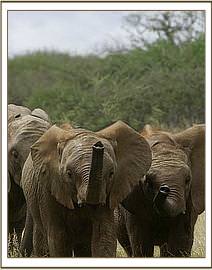 On arrival the orphans were clearly dazed and confused, and in the case of Orok very suspicious of his milk bottle, convinced he was going to be goaded into another unpleasant experience if he followed it. Challa too showed his displeasure by taking it out on the other two, Sidai and Orok, by pushing and shoving, reversing into them, and lashing out with a back leg whenever he could. They settled down fast and then the older Ithumba resident orphans were brought to meet them. Amidst a great noise, trumpets and trunks in the air, the other orphans enveloped the new arrivals. Nasalot in particular immediately took on the role as protector, nurturing them all with low rumbles, gentle caresses and by putting her trunk gently in their mouths. The whole group was clearly very excited indeed to receive the new babies. They appeared so big at the Nairobi Nursery, but suddenly seemed so tiny and vulnerable measured against the older orphans.