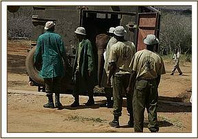 The day was an overcast one which helped enormously, as the journey can otherwise be very hot for the young elephants in the back of the trucks. They traveled in the company of their Keepers, with the David Sheldrick Wildlife Trust’s mobile Veterinary Unit following the convoy just in case one of the elephants panicked. The whole move was coordinated by Daphne’s son in law Robert Carr-Hartley. Robert’s guidance ensured the move was a success, with the convoy stopping en route to cut the elephants favourite browse, to feed them their milk, and to wet them down to prevent them from over heating and of course to ensure the Keepers had drinks and food while in the back of the vehicle. The convoy made good time, and by midday Ithumba Mountain loomed on the horizon.
