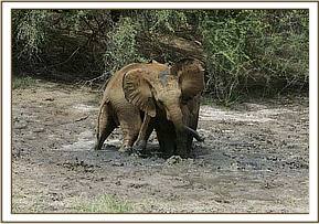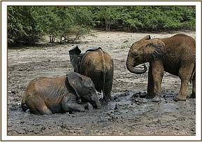 By the next day the latest arrivals seemed totally settled and spent time wallowing around in the mudbath and making new friends. They were missed sorely by the seven orphans that remained behind in Nairobi, Lualeni, Makena, Zurura, Sian, Loijuk and Kamboyo and of course Kora, who was held back with Lualeni as company, to undergo his operation later this month on his jaw. The day Orok, Sidai and Challa left Lualeni was very distressed, and immediately went to where they were loaded onto the trucks, knowing they had been whisked away in them, even though when the loading had happened early that morning she was still asleep in her stable. Despite a wobbly beginning they too have now settled down into a routine with just the seven of them.