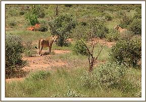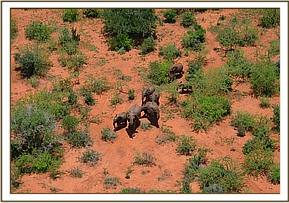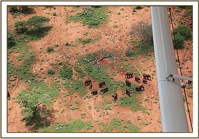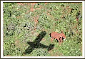 With Julius in the back they revisited all the small herds in the area, circling them once at about 100 ft. Julius was confident about being able to recognise his elephants so the search continued for an hour, time slowly running out. The aircraft returned to where Nick started the search, where there were three scattered herds, checking one last time on each one. Suddenly they spot two huge lions skulking in the bush close to a small herd of elephants. As the plane circled in tightly the lions glared up at the pilot and Keeper on-board, getting a better look at the small herd being preyed by the lions Julius suddenly shouted out "go back around". They circle tightly once more to the right and come back over the herd which has three younger calves off to one side, not far from the two lions. This they did three or four times until Julius decided for sure that their orphan Mbirikani was one of them. Feeling relieved but still under pressure to get to Mbirikani in time, before she disappears or worse still the lions get to her, they called the ground crew in by radio and kept circling Mbirikani so they could guide the Keepers on the ground to the correct location, all the while mindful that the lions too have her in their sights. It took the ground team at least twenty minutes to fight through the thick bush to catch up with the orphan, who has now broken away from the group and is following a bull elephant. Eventually the team caught up with her, the keepers jumping out of the car following Mbirikani until they could slow her down and encourage her home to the stockades.