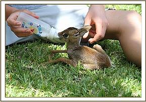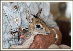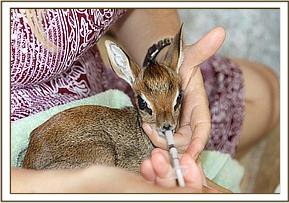 On arrival to the nursery both Dik-Diks, which are the smallest antelopes in Kenya, have been nestled away together from the rest of the world in a basket, to simulate what their mothers would have done, laying them up to keep them protected from predators until they were strong and fast enough to escape. With regular milk feeds they have been slowly introduced to the outside world at the nursery, and they now enjoy full days outside in Angela's garden with a Keeper on hand to protect them from both birds of prey and the dreaded baboons, whilst they discover all the fresh vegetation on offer as they start to eat greens.
