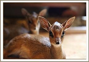 They both have wonderful tufts of hair on their crowns, and in Hoho's case where mini horns will one day grow. They both have black spots below the inside corners of each eye where a gland produces a dark, sticky secretion used to scent-mark their territories. Another interesting characteristic of Dik-Diks is their inquisitive elongated snouts with bellow-like muscles, which are used to pump and recirculate cooled blood around the body to prevent overheating.