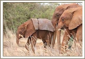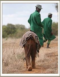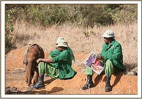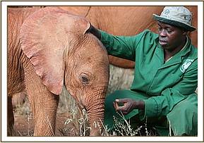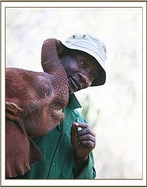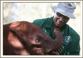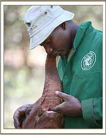 This man stands out above all others, and has done for ever since he left his Night Watchman’s job and became an elephant Keeper way back in the mid l980’s. He simply has a unique heart, which every elephant that has ever passed through our hands has recognized, irrespective of age or origin, and to which they have responded with an outpouring of love. Over 130 orphaned elephants have selected Misheck as their favourite human family member. He can work miracles with a heartbroken baby who simply does not want to live. He exudes confidence, humility and a depth of understanding of elephants that is quite unique, so just his quiet presence can turn things around overnight, and has done so, on many occasions. Naipoki, like all others before her , battened on to him instantly. She talks to him with special vocalizations every time she is with him, glued to his side as she wraps her trunk lovingly around him and pleads to be allowed to suck a finger whenever in his presence. This attachment is accepted by all the other elephants – even Shukuru, who also adores Misheck and who has always been extremely possessive of him. However, she is quite happy to share him with little Naipoki, though not the others. Little Cherub Naipoki can do no wrong in the eyes of all the other orphans, and also in the eyes of all the Keepers, but Misheck alone can claim the unique status of being an “Elephant Whisperer”, whose heart, when it comes to animals, has to be pure, because all elephants can read one’s heart and over 130 elephants simply cannot be wrong!.