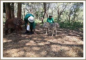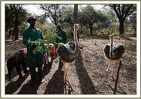 Pea and Pod have grown up with our orphaned elephant herd ever since, and are now an intrinsic part of our Nursery Unit. They provide endless hours of entertainment for the elephants who love to charge them, hug them, and positively maul them, although taller than their elephant peers in this short time these long suffering feathered friends remain very protective of the herd! It is a most unlikely combination which has formed an enchanting inseparable friendship.