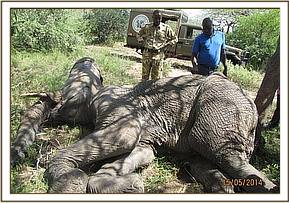 Poaching Postmortem: Both tusks intact but signs of attempted removal. Several penetrating wounds found
