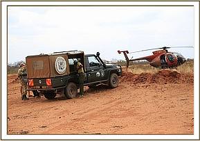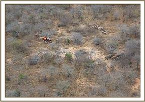 With all teams ready and in position the elephant was successfully separated from his small herd and driven gently by the aircraft to an open area where the ground team and vehicle was waiting. The bull was darted first time and the helicopter landed close by giving Dr Njoroge easy access to his patient.