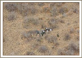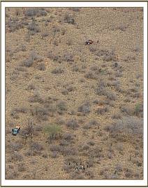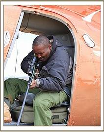 Whilst Dr Poghon was heading to his case in Tsavo East, Nick Trent, one of the David Sheldrick Wildlife Trust’s pilots based in Tsavo, was directing an aerial training patrol with two KWS pilots over Tsavo West. It was during this patrol that Nick sighted the second wounded elephant and DSWT/KWS Amboseli vet Dr Njoroge was alerted for veterinary support. DSWT Helicopter pilot Humphrey Carter collected Dr Njoroge, coordinating activities with pilot Nick who was monitoring the location of the big bull and arranging for an anti-poaching ground team to be on site for back-up support.