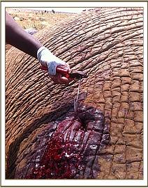 The elephant bull was soon found feeding nearby in the company of another bull. Dr Poghon and the DSWT/KWS Tsavo Mobile Veterinary Unit team prepared the immobilization drugs and the elephant was darted with ease. It took five minutes for the dart’s drugs to take effect and the patient fell on the right side, luckily leaving the injured leg easily accessible for treatment. The wound was washed and cleaned exposing a small injury typical of an arrow. The deep wound was examined and a metallic object could be felt lodged 10cms beneath the skin. The wound was widened to allow for extraction and after a 15 minute struggle a sharply pointed arrow head was finally removed to everyone’s relief.
