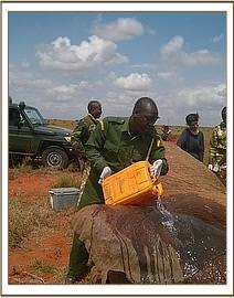 Treatment began immediately as Dr Njoroge set to work cleaning out the wound, which was soon confirmed that it was indeed caused by a poisoned arrow. The vet cut the external wound in order to clean out the dead flesh below the entry point of the arrow whilst also cutting below the wound to create a drain and following up with all the necessary medications needed to encourage fast healing. After 45 minutes of treatment Dr Njoroge finished his operation by injecting the revival serum and within two minutes the big bull began to stir and soon stood slowly up finding his feet before walking off slowly to regroup with his friends.