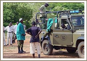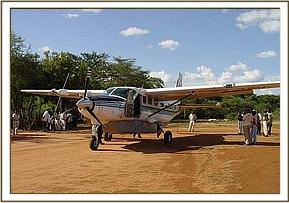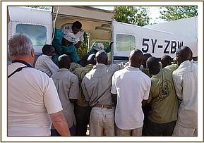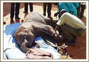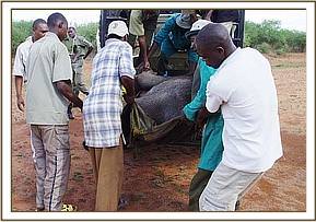 The plane landed at an airfield near the Voyager Lodge on Ziwani Sisal Estate which borders Tsavo West’s Southern boundary, where the rescuers were waiting with the calf. He was loaded onto our rescue tarpaulin and hauled into the plane, arriving at Wilson Airport Custom’s Office just before 6 p.m. where an astonished crowd of curious onlookers watched the process of getting him out of the plane, and onto the back of the Trust Pickup!