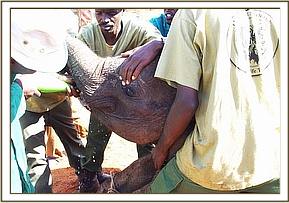 16th November 2005, and an S.O.S. from our Ziwani De-Snaring Team Leader operating in Tsavo West National Park, that he had received a report the day before that a young elephant had been in amongst a herd of Cattle for the past eight days. The De-Snaring Team located the elephant at 11.00 am., still in amongst the herd of cattle, at a place called “Challa” (which means “Source of the Volcanic River”). At the request of the herdsmen who had reported his presence, the elephant orphan has been named “Challa”.