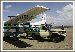 Batian Craig phoned us in Nairobi, and the elephant rescue was immediately organised. Robert Carr-Hartley left in a chartered Caravan aircraft with two Keepers and all the usual rescue paraphernalia, including a KWS Vet, in case it was necessary to sedate the calf, since we had been told that it was about 2 years old. Upon landing at the Ol Pejeta airfield, the Rescuers were driven by Batian Craig to the location of the calf, which was still hiding in thick “Euclia” bush. Armed with a blanket, Robert decided to avoid darting the calf to tranquilize it, since it was obviously weakened and therefore fragile. The rescuers fanned out, and cautiously approached the calf, and as it began to run, the Keepers managed to throw the blanket over its head and eyes, which enabled everyone else to wrestle it to the ground and bind its legs. Recumbent, the captured calf was then carried to the waiting vehicle on the Rescue tarpaulin, and transported to the Rescue Plane, where it was loaded and began the air journey back to Nairobi.