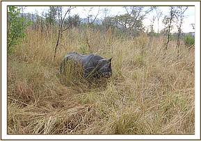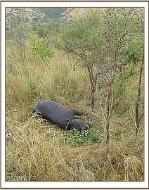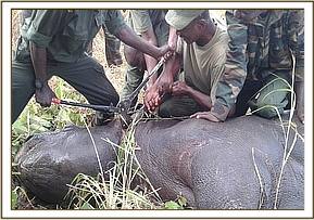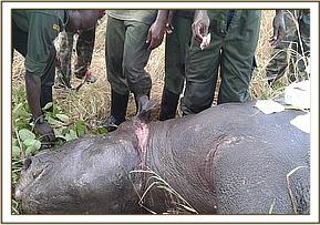 Once the team reached Ruma they were directed to where the injured rhino was last sighted. Chemical immobilization was done on foot since the thick vegetation cover inhibited the use of a vehicle. Once he was successfully darted he ran off quite a distance before collapsing, but with aerial support provided the veterinary team were guided to where he had fallen. Stabilization of respiration was achieved when 5mg Butorphanol tartrate was injected through the auricular vein.