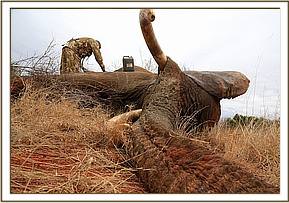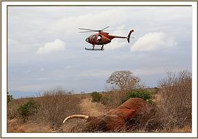 //www.youtube.com/watch?v=6PVhRjCN6GkWith good-sized tusks and walking alone, the bull’s wound was clearly visible on his flank, gushing with puss as he moved slowly along. Fortunately that day both the DSWT helicopter and Tsavo Mobile Veterinary Unit with Dr.Poghon, a KWS vet officer, were close at hand so that treatment could be rapidly arranged before the bull disappeared into the vast landscape of Tsavo.
