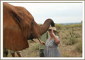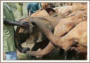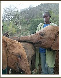 Friday 18th June – another Big Day in our Nairobi Nursery, for this is the day that Seraa, Mpala, and Morani will leave Nairobi to join the Tsavo Orphans and begin their gradual transition back into the Elephant World in Tsavo East National Park. Seraa, now a plump and healthy 19 month old, well over the life threatening pneumonia that almost took her from us on New Year’s eve, 2002; Mpala obviously a little older upon arrival than we thought, now sporting the tiny tusks of a two year old, and Morani, the little “Warrior” whose gunshot wounds have now healed, and who is the youngest of the three. He has only been with us some three months, and since Mpala is his special friend, he, too, was a candidate for Tsavo.