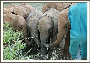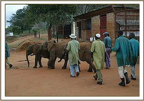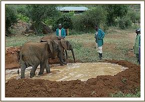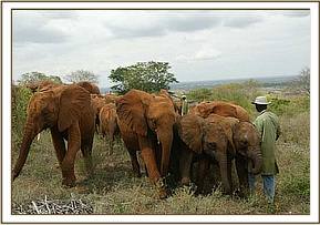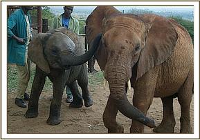 Of the Keepers that accompanied the three new arrivals, David Mutie was known to all the Tsavo Group, having spent a long time working with them, so he, too, received an exuberant elephant welcome. Keeper Julius was a particular favourite of the Nursery Elephants during his term of office, and they were delighted to see him again. Nasalot, especially, paid him special attention, and this touched him deeply, because he doubted that her group would remember him. Now, he knows “that an elephant never forgets!” He spent the first night sleeping close by the Night Stockade that housed the new arrivals, and during the night just one change had to be made to the sleeping arrangements, which entailed moving Burra and Sosian into the adjoining Stockade, since they were playing one-upmanship with Morani.