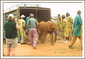 As usual, the practice sessions to get the orphans comfortable going into the large truck parked up against our loading ramp began three days earlier. As we suspected, the only elephant who firmly refused to be coaxed inside, was Mpala, for he obviously clearly remembered, with bad connotations, another journey in a vehicle when he travelled to Nairobi from far off Mpala Ranch in Laikipia in a vehicle. At that time he was newly orphaned, an emaciated orphan who trailed the cattle herds following the death of his mother on the Ranch, having been fatally wounded by poachers beyond the Ranch boundary.