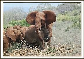 There is always a great deal of excitement amongst all the Tsavo group when newcomers arrive, and it was no different on this occasion. Trunks enveloped the newcomers, many laid across their back in a gesture of love, and they could not help but feel immediately part of this larger family of larger elephants – in fact, a veritable “herd” of elephants, led by the Matriarch, Emily. Seraa was the only one of the three who probably would not remember her elephant family clearly, because she came in so young, but she was too over-joyed to see Solango and Thoma again, that she remained remarkably undaunted surrounded as she was by so many older elephants.