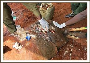 Shimbas wounds were immediately extensively cleaned and treated and while terribly sore, he appeared to be healing and improving. A week later Dr. Poghon returned to Tsavo having been away with his family for a week of rest. With Dr. Poghon back it was decided to anaesthetise Shimba in order to take a very close look at the wounds and how things were progressing to ensure that they could once again be thoroughly cleaned. The wound on his ear extensive and very deep, but the miracle of green clay had kept it free of infection. The wounds were thoroughly cleaned again and packed with the green clay, and before long Shimba was back on his feet. Dr Poghon reassured us all that this tough little elephant was recovering well and would do so he thought without any permanent damage to his trunk, ear and back right leg, where some other bad wounds were located.