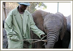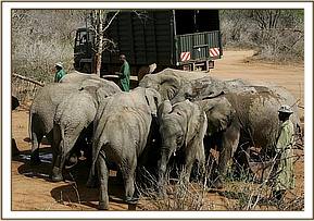 The actual move at dawn was accomplished smoothly, although loading Sian into the truck was a challenge, for she was determined not to go in. However, Loijuk was trusting, and Kenze followed the bottle, anxious never to be deprived of milk again. However, Sian had to be roped and man-handled into the truck, one Keeper in front hauling on a roped foreleg, and all available manpower at the Nursery behind and at the sides pushing with all their strength! Anxious thoughts were for “Misheck” the Keeper most loved by all our elephants, who was at the unenviable “sharp end” in front, since Sian was highly stressed, and equipped with short sharp tusks that could inflict injury. Nevertheless, despite her fear, and the trauma to which she was suddenly subjected, she was so trusting and gentle of beloved Misheck, that no attempt was made to skewer him in retaliation, although this would have been quite possible. With the back door slammed shut, she was calm and accepting of her new predicament and bore no grudges against Misheck and the other Keepers.