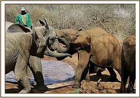 Sian, was an Amboseli baby, whose mother, (named Soila by the Researchers), had accompanied the herd into neighbouring Tanzania. When the herd returned, Soila was missing, but they brought back 9 month old Sian, now obviously an orphan, her mother likely to have been shot by ruthless ivory hunters who habitually wait in ambush just across the border in Tanzania, to bag a prize pair of Amboseli elephant tusks. Fortunately, Sian came to us in reasonable condition, so her recovery was much more rapid as was her psychological healing, for she found herself a mother figure so many other smaller babies, who looked to her for comfort.