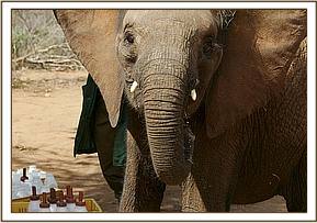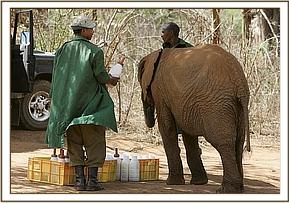 Kenze was another story. I think none of us who witnessed his arrival had ever seen an animal in a worse condition. Not only was he also a bag of bones due to milk deprivation, despite being almost two years old, but every square inch of his body was covered in ticks of all shapes and sizes, and his underbelly was a suppurating mess, having been chewed by a small predator, since luckily he had not been deprived of his “bullhood”. Over an above this, his loathing of the human species was very evident, and with every last ounce of strength, he longed to settle the score and kill whoever he could, even though he had ventured close to a community village bordering the Chyulu hills, knowing that this was his only chance of avoiding being devoured by lions or hyaenas. Quite obviously, this little elephant had witnessed a horrendous tragedy perpetrated by humans, because even today, he chooses to avoid contact, even with his Keepers, only coming to take his milk feeds, and then separating himself from both the Keepers and the other elephants, grieving deeply for his lost loved ones. In his case, there was nothing we could do for him until he had expended that last ounce of strength, and collapsed in a near comatose condition, unable to even lift his head. Then it was a race against time. The Vet was standing by, waiting for that moment, to insert an intravenous drip into an ear vein, the Keepers were there with a weak solution of milk and rehydrants, lifting his head so that he could swallow, whilst others removed what ticks they could, and sprayed the clusters of tiny small ones with Frontline. Having administered the injection of anti-biotic plus Vitamin B and other life boosters, the Vet then set about cleaning out the wound on his belly and Daphne rushed into the kitchen to make little cakes of cooked oatmeal mixed with desiccated coconut and milk which were put directly into his mouth.
