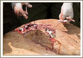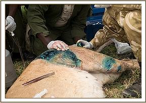 The Mara Vet Unit responded rapidly, ready to dart Siena for a fourth time in a completely unrelated incident and what seemed to be an unbelievable turn of bad luck. The Vet team found Siena with multiple lacerations and bite wounds on her back legs and tail, but worse still the wound that had taken so long to heal had been opened up once again.