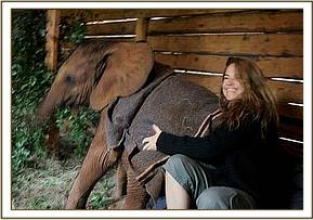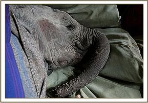 As the dawn broke over Amboseli and Mt. Kilimanjaro, Cynthia Moss and the rest of the Amboseli Elephant research team returned to the airstrip to see how everybody had fared overnight. There she found three tired men having had no sleep at all, but Sinya sound asleep. Before the rescue plane arrived the Keepers took their young charge for a walk down the airstrip and she followed them willingly, ravenous for more milk. It was not long before the plane arrived with Robert, another Keeper, armed with freshly mixed milk, and some breakfast for Stephen, Amos and Josophat, who by this stage were exhausted. Sinya was loaded into the aircraft with the help of KWS personnel and the Amboseli Elephant Research Unit and flown directly to Wilson Airport in Nairobi and once there then had to endure another short journey in the back of the pick up to The David Sheldrick Wildlifes Nairobi Nursery situated in Nairobi National Park.
