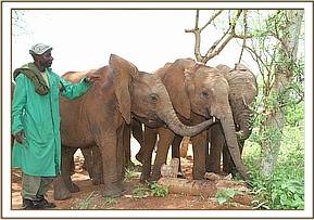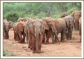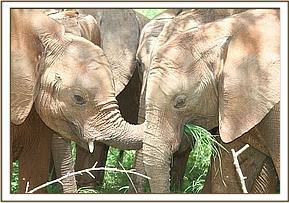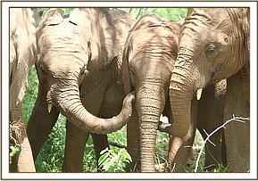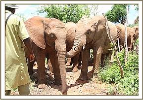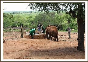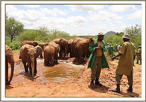Trumpeting was soon herd in the distance and within minutes the first group of the Ithumba milk-dependant orphans were charging down the hill towards Sities, Kainuk and Turkwel. With rumblings of greetings and excitement the new arrivals were embraced into a group hug before everyone got their milk bottles and the next group of orphans were released to join the party. The Ithumba orphans relocated to Tsavo from Nairobi in the last couple of months including Mutara, Shukuru, Kilabasi and Kanjoro, were all exceptionally happy to see some of their old Nursery friends and there was much shoving and trumpeting as they all wanted to get close to them to say hello. All of the keepers tried their best to keep the party under control as elephants charged here, there and everywhere, playing in the small mudbath in at the stockades, flinging mud, water and dust and browsing on the freshly spouted greens colouring the compound.