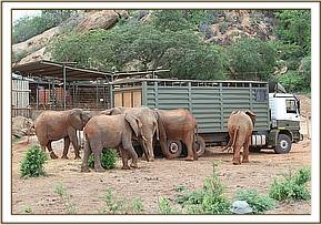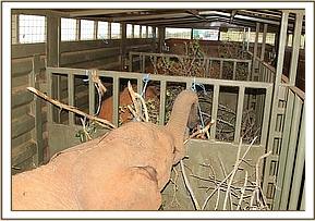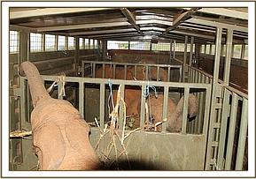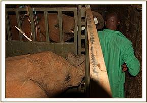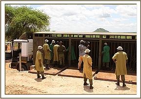 After the Stresnil had kicked in, the Keepers gathered together quietly, one picking up a bottle of freshly mixed milk and opening Sites stockade door first. Gently calling her name, Sities followed her milk out of the stockade across the compound and towards the truck, grabbing tasty mouthfuls of milk on the way. After a very short hesitation at the truck, she happily followed her milk into the truck compartment before the gate was closed gently behind her. Kainuk was next to come out of her stockade, again she slowly but trustingly followed her keeper and her milk, and walked straight into her compartment next to Sities. Turkwel was last to be led out and was immediately much more cautious about what was going on, it took a lot more coaxing and two bottles of milk to get her closer to the truck before she was persuaded inside and the gate was locked behind her before she could barge out.