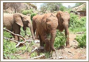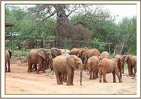 Just five minutes after the orphans had disappeared out of sight into the thick green bush surrounding the stockades suddenly Tomboi appeared around the corner, walking slowly but purposely towards the stockade grounds. One minute later, and as if from out of nowhere the entire ex-orphan herd appeared including Yatta and Mulika and their babies as well as three wild bulls including Kijana and Mgeni. Immediately approaching the elephant-mover truck, they smelled it carefully, touching the compartment doors gently with their trunks knowing for certain that Ithumba had received new young elephants. Before enjoying some fresh water at the stockade water trough, all of the wild and ex-elephants headed off after the orphan herd who were now only a short distance away, wanting to greet the new arrivals and spend a while with the keepers and their friends.